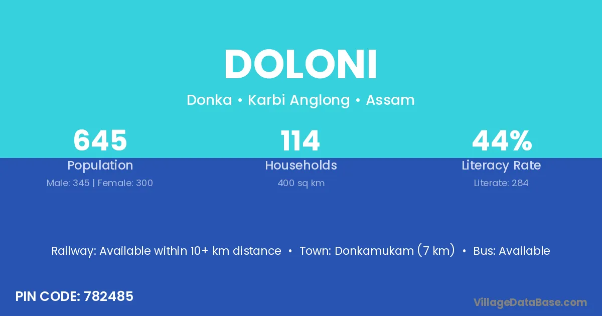 Doloni village has a total population of 645 people, of which 345 are males and 300 are females.