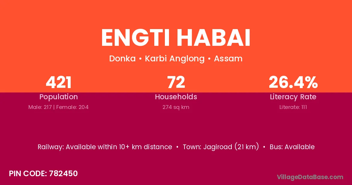 Jagiroad (21 km) is the nearest town to Engti Habai village for major economic activities and is located approximately 21 km away.