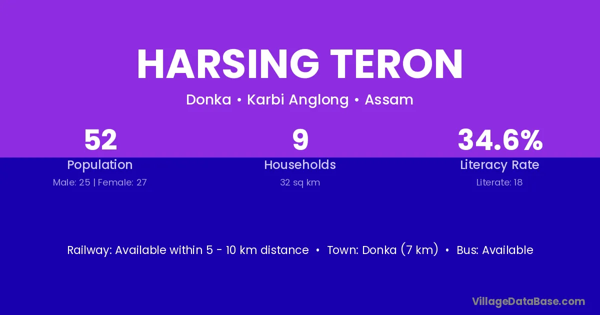 Harsing Teron village has a total population of 52 people, of which 25 are males and 27 are females.