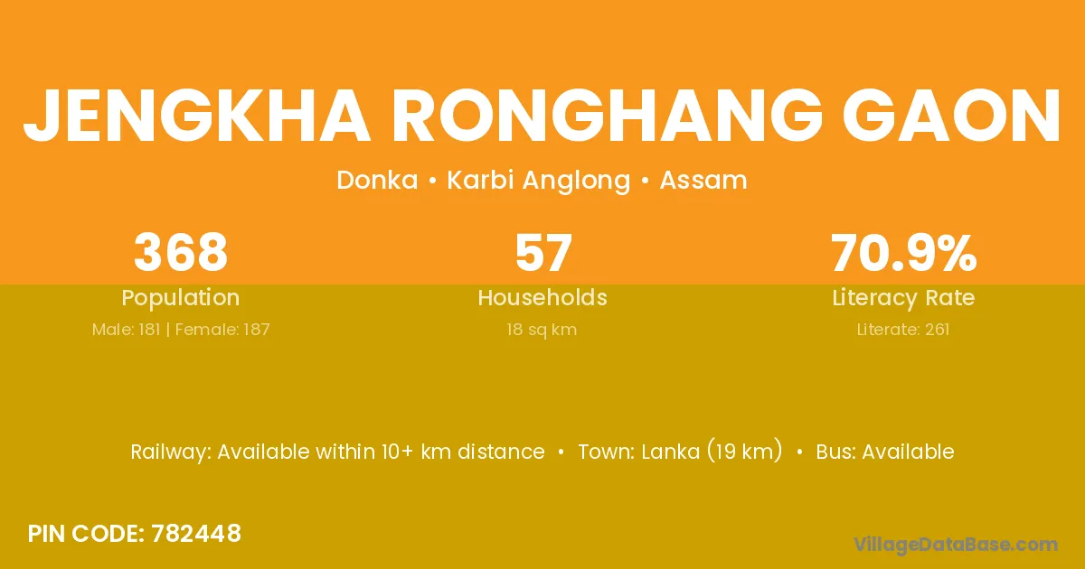 Jengkha Ronghang Gaon village has a total population of 368 people, of which 181 are males and 187 are females.