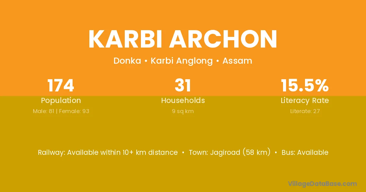 Karbi Archon village has a total population of 174 people, of which 81 are males and 93 are females.