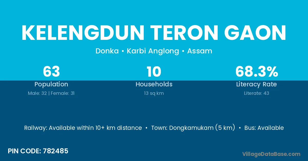 Kelengdun Teron Gaon village has a total population of 63 people, of which 32 are males and 31 are females.