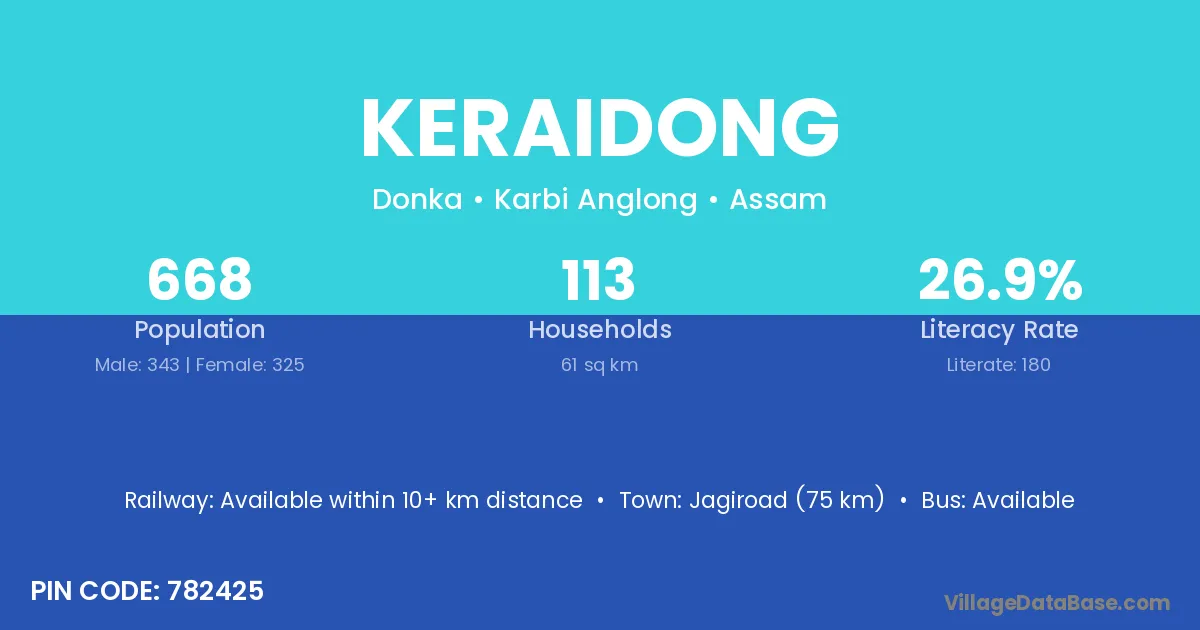 Jagiroad (75 km) is the nearest town to Keraidong village for major economic activities and is located approximately 75 km away.
