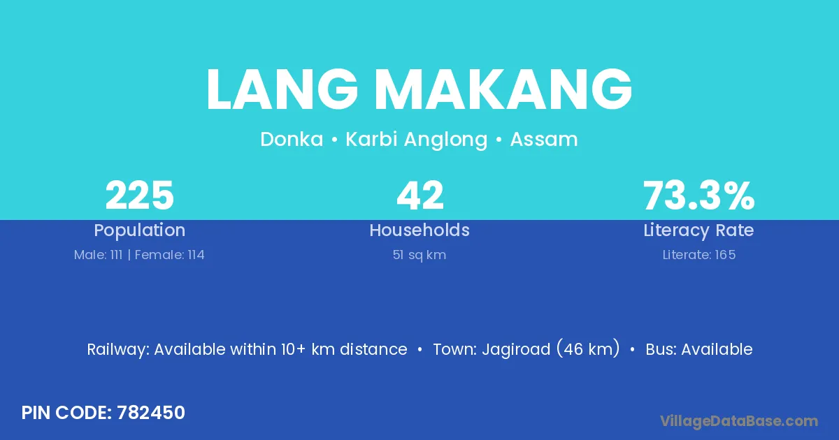 Jagiroad (46 km) is the nearest town to Lang Makang village for major economic activities and is located approximately 46 km away.