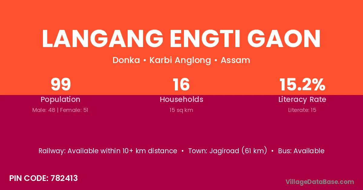 Jagiroad (61 km) is the nearest town to Langang Engti Gaon village for major economic activities and is located approximately 61 km away.