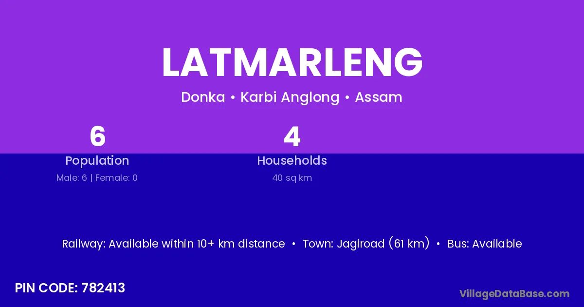 Jagiroad (61 km) is the nearest town to Latmarleng village for major economic activities and is located approximately 61 km away.