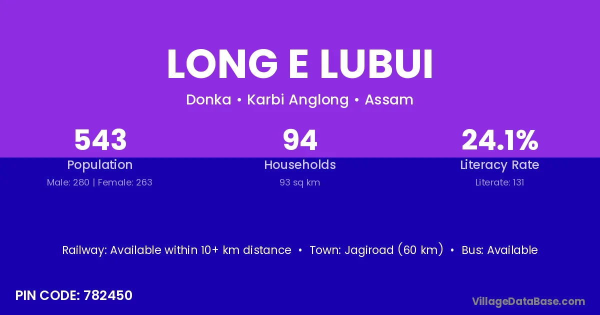 Jagiroad (60 km) is the nearest town to Long E Lubui village for major economic activities and is located approximately 60 km away.