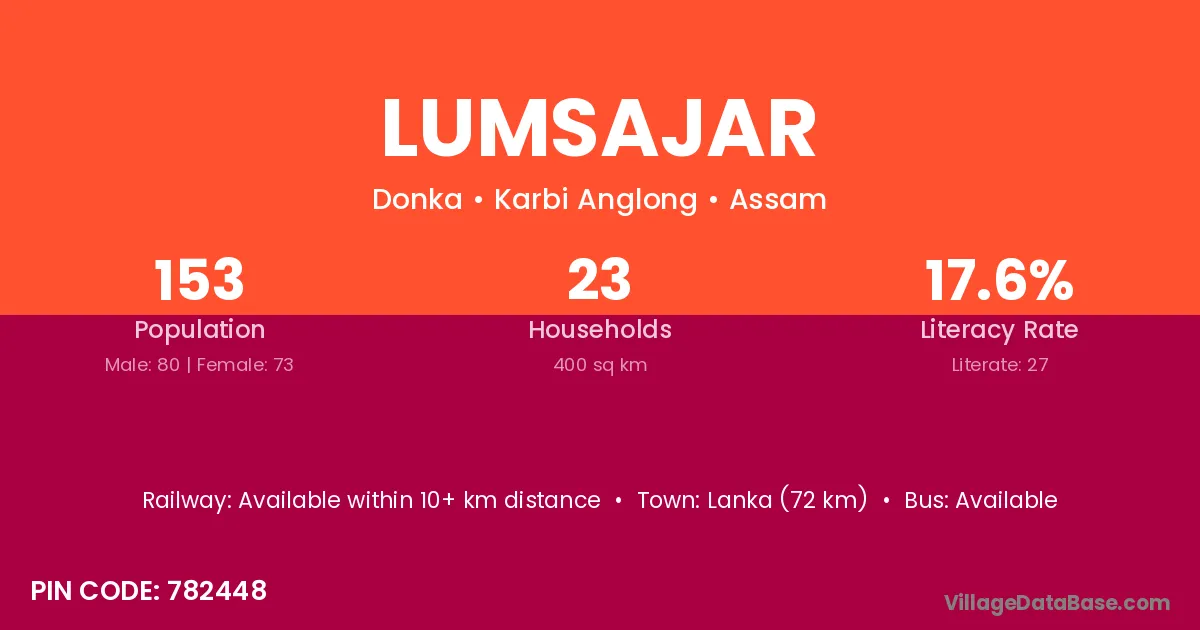 Lanka (72 km) is the nearest town to Lumsajar village for major economic activities and is located approximately 72 km away.