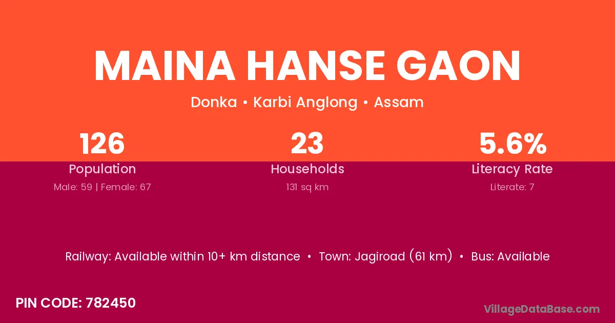 Jagiroad (61 km) is the nearest town to Maina Hanse Gaon village for major economic activities and is located approximately 61 km away.