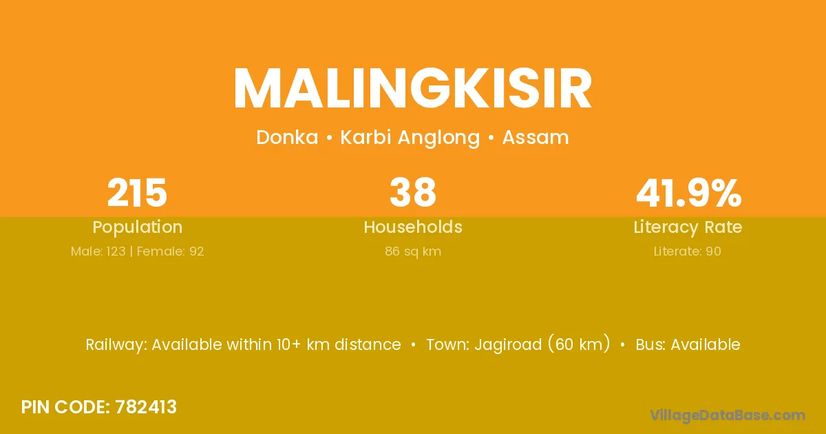 Jagiroad (60 km) is the nearest town to Malingkisir village for major economic activities and is located approximately 60 km away.