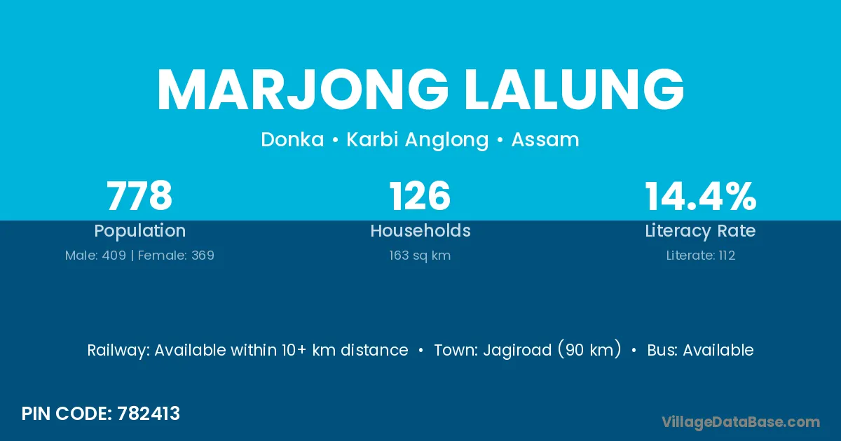 Jagiroad (90 km) is the nearest town to Marjong Lalung village for major economic activities and is located approximately 90 km away.