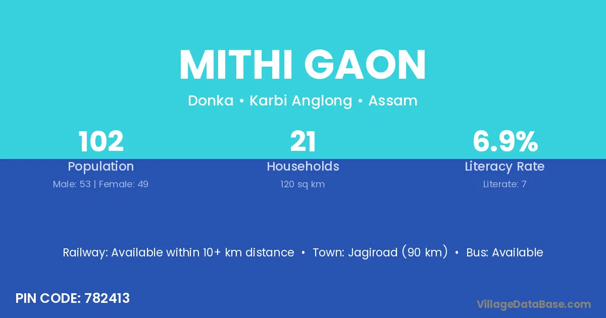 Jagiroad (90 km) is the nearest town to Mithi Gaon village for major economic activities and is located approximately 90 km away.