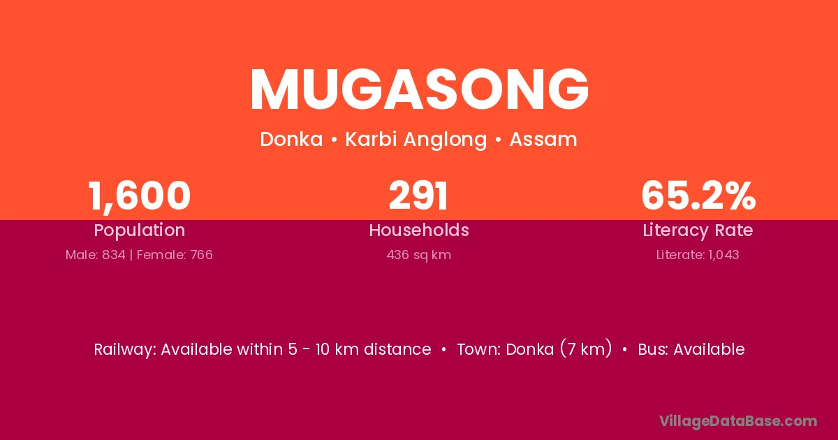 Mugasong village has a total population of 1,600 people, of which 834 are males and 766 are females.