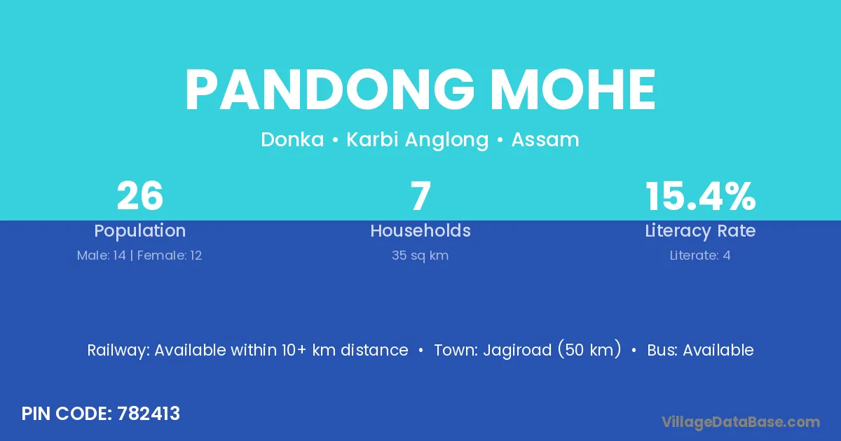 Jagiroad (50 km) is the nearest town to Pandong Mohe village for major economic activities and is located approximately 50 km away.