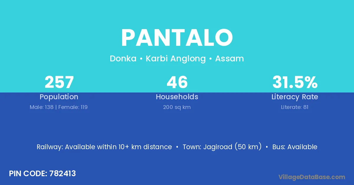 Jagiroad (50 km) is the nearest town to Pantalo village for major economic activities and is located approximately 50 km away.