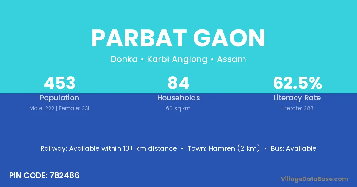 Parbat Gaon village has a total population of 453 people, of which 222 are males and 231 are females.