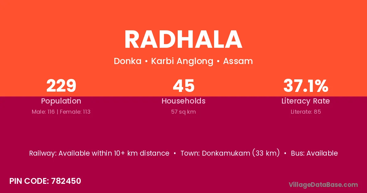 Donkamukam (33 km) is the nearest town to Radhala village for major economic activities and is located approximately 33 km away.