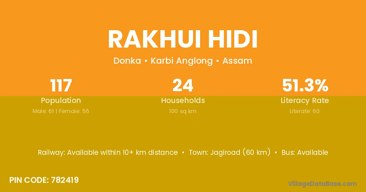 Jagiroad (60 km) is the nearest town to Rakhui Hidi village for major economic activities and is located approximately 60 km away.