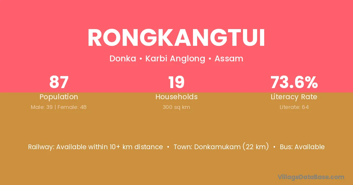Donkamukam (22 km) is the nearest town to Rongkangtui village for major economic activities and is located approximately 22 km away.