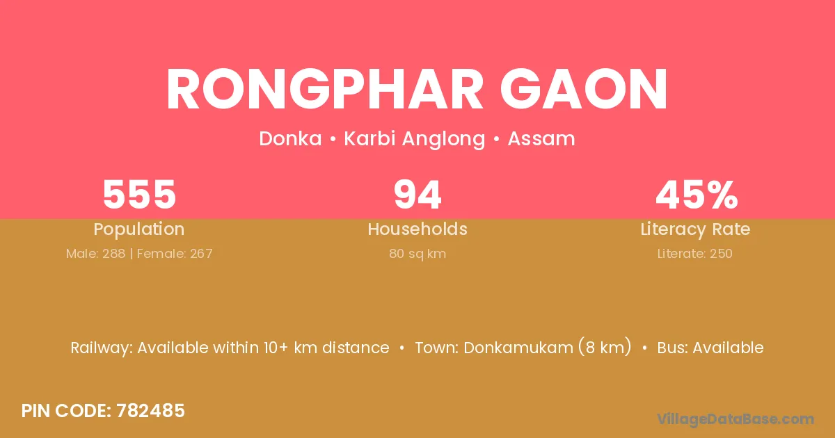 Donkamukam (8 km) is the nearest town to Rongphar Gaon village for major economic activities and is located approximately 8 km away.