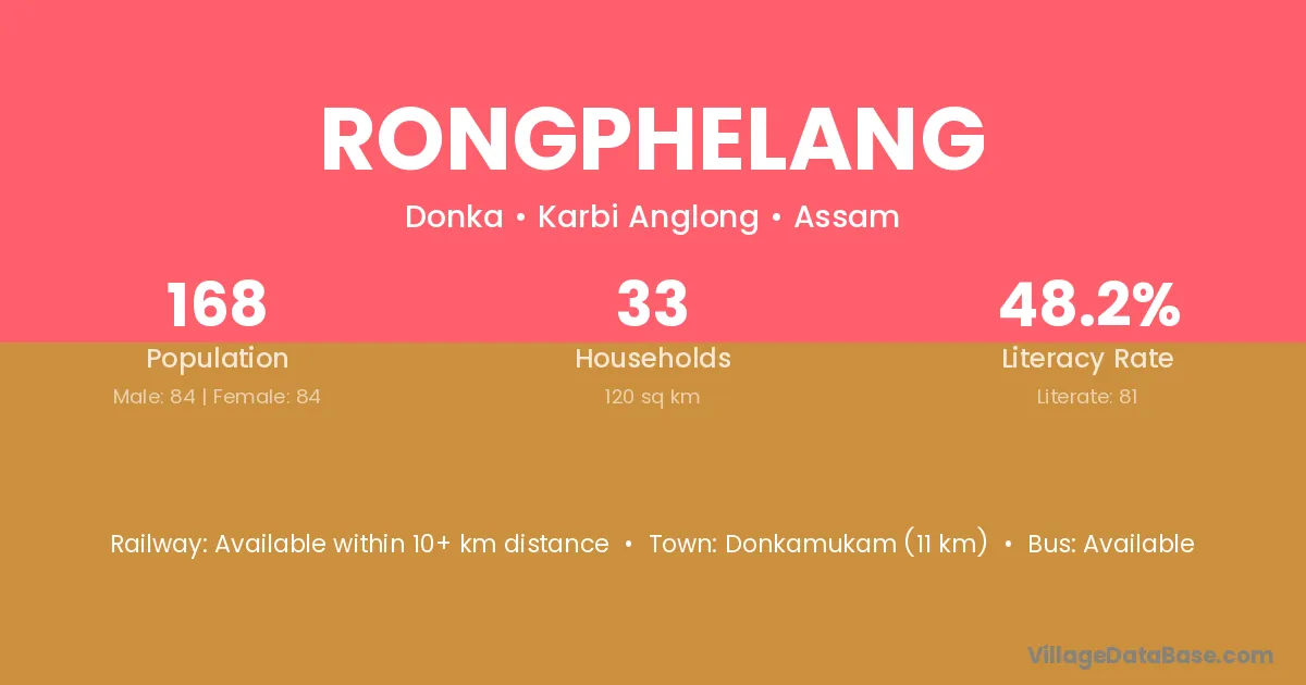 Donkamukam (11 km) is the nearest town to Rongphelang village for major economic activities and is located approximately 11 km away.