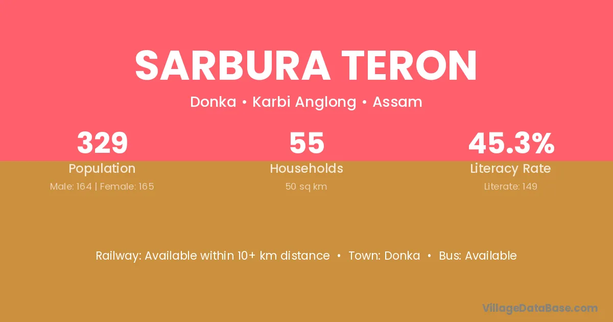 Sarbura Teron village has a total population of 329 people, of which 164 are males and 165 are females.