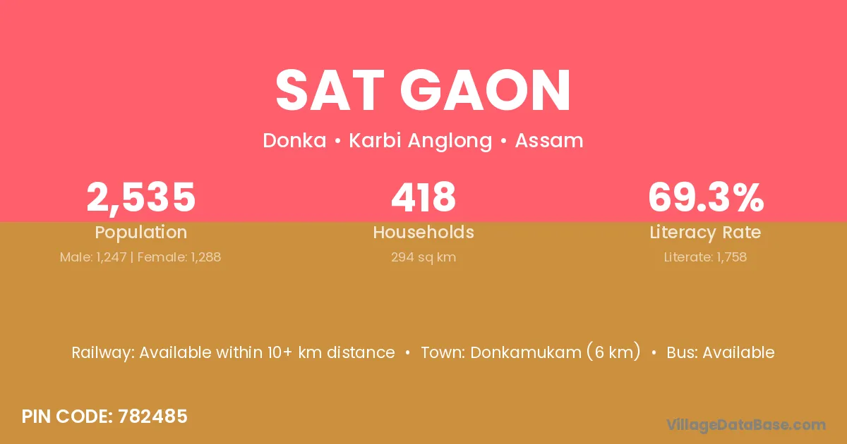Donkamukam (6 km) is the nearest town to Sat Gaon village for major economic activities and is located approximately 6 km away.