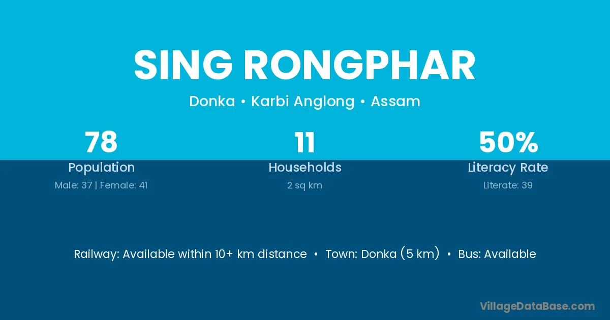 Sing Rongphar village has a total population of 78 people, of which 37 are males and 41 are females.