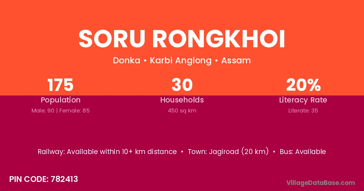 Jagiroad (20 km) is the nearest town to Soru Rongkhoi village for major economic activities and is located approximately 20 km away.