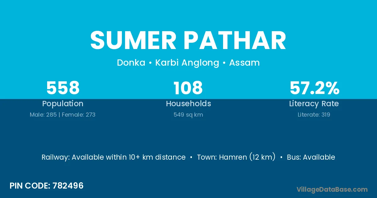 Hamren (12 km) is the nearest town to Sumer Pathar village for major economic activities and is located approximately 12 km away.