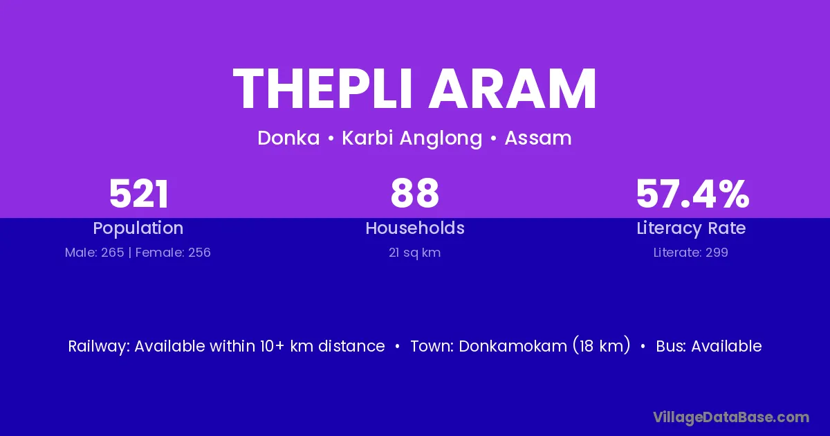 Donkamokam (18 km) is the nearest town to Thepli Aram village for major economic activities and is located approximately 18 km away.