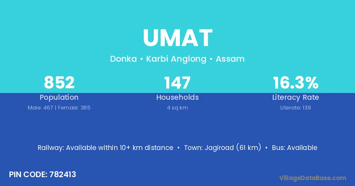 Jagiroad (61 km) is the nearest town to Umat village for major economic activities and is located approximately 61 km away.