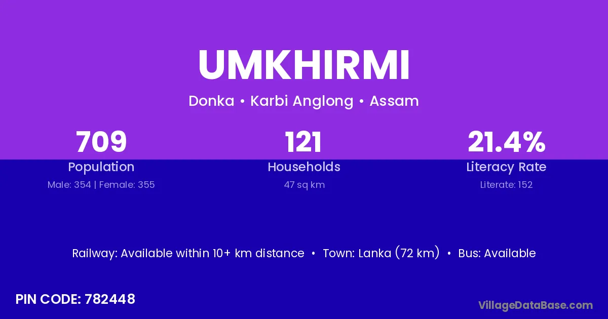 Lanka (72 km) is the nearest town to Umkhirmi village for major economic activities and is located approximately 72 km away.