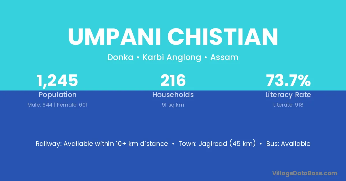 Jagiroad (45 km) is the nearest town to Umpani Chistian village for major economic activities and is located approximately 45 km away.