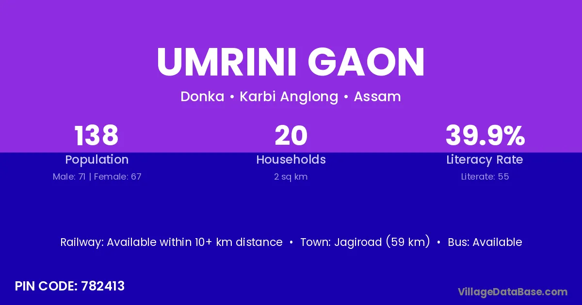 Jagiroad (59 km) is the nearest town to Umrini Gaon village for major economic activities and is located approximately 59 km away.
