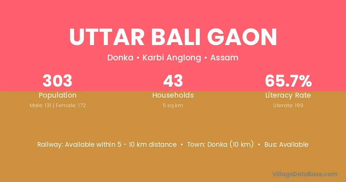 Uttar Bali Gaon village has a total population of 303 people, of which 131 are males and 172 are females.