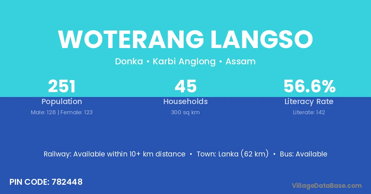 Lanka (62 km) is the nearest town to Woterang Langso village for major economic activities and is located approximately 62 km away.