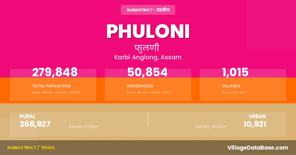 Phuloni is a town and Subdivision in the Karbi Anglong district of the Assam. In India, a Subdivision is a subdivision of a district responsible for the administration and revenue collection of a specific area within the district. Subdivisions play a crucial role in the local governance structure, contributing significantly to the development and administration of their communities.
