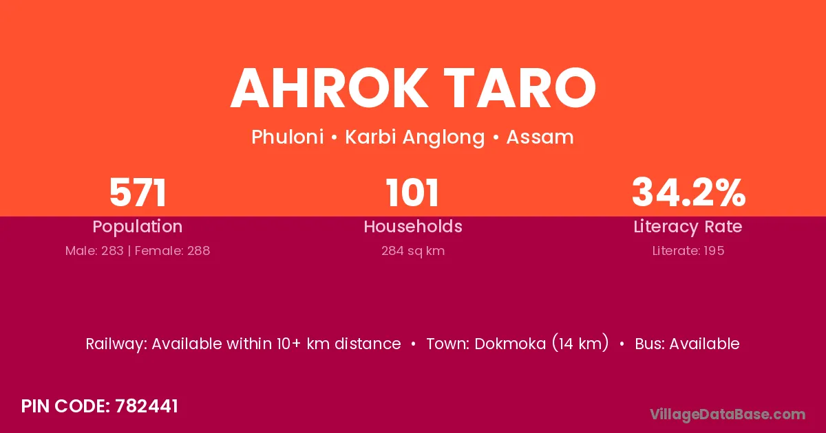 Dokmoka (14 km) is the nearest town to Ahrok Taro village for major economic activities and is located approximately 14 km away.