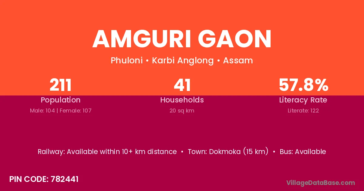 Amguri Gaon village has a total population of 211 people, of which 104 are males and 107 are females.