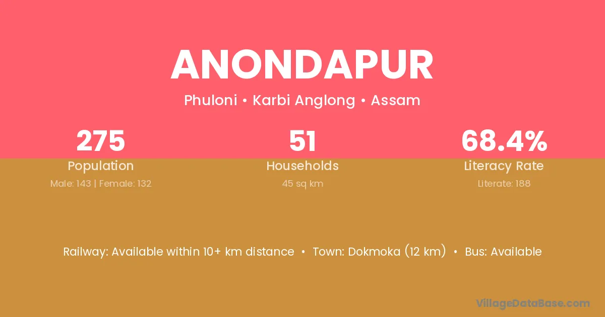 Dokmoka (12 km) is the nearest town to Anondapur village for major economic activities and is located approximately 12 km away.