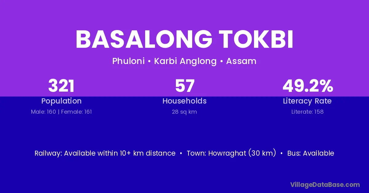Howraghat (30 km) is the nearest town to Basalong Tokbi village for major economic activities and is located approximately 30 km away.