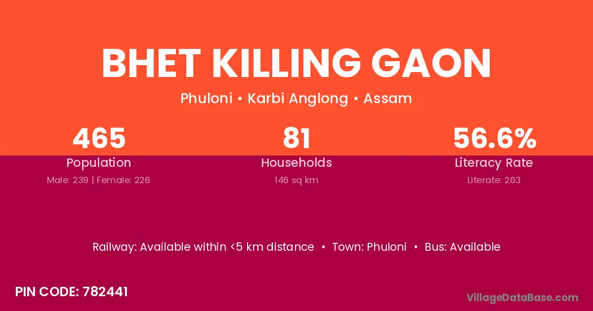 Bhet Killing Gaon village has a total population of 465 people, of which 239 are males and 226 are females.