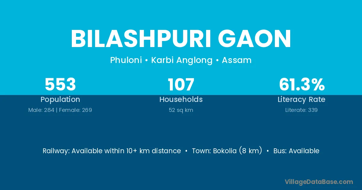Bilashpuri Gaon village has a total population of 553 people, of which 284 are males and 269 are females.