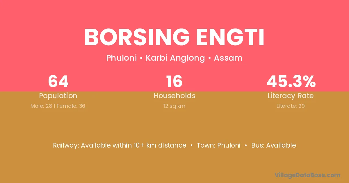 Borsing Engti village has a total population of 64 people, of which 28 are males and 36 are females.