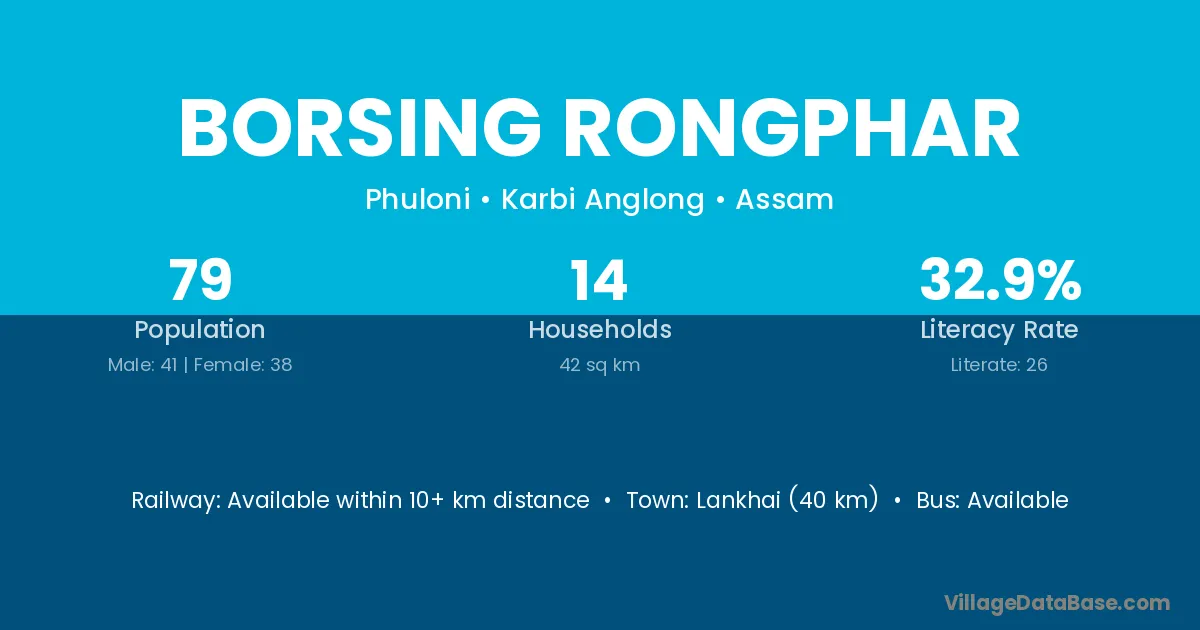 Borsing Rongphar village has a total population of 79 people, of which 41 are males and 38 are females.
