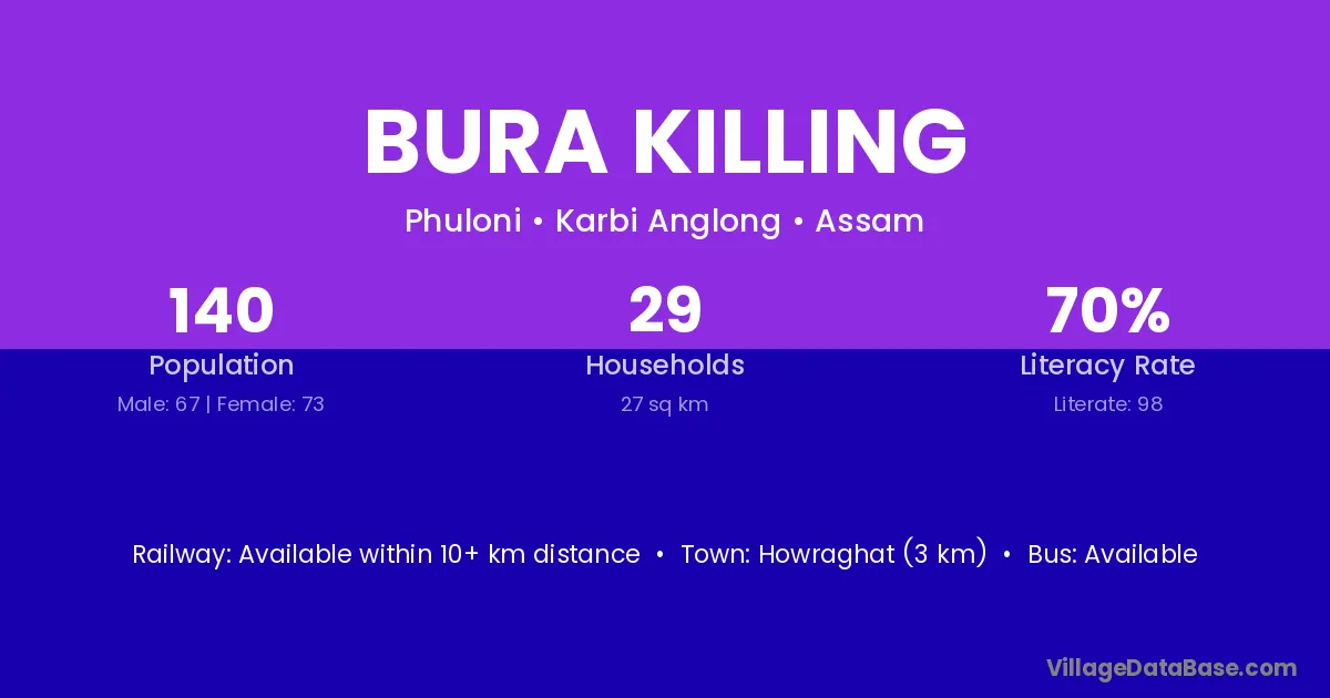 Howraghat (3 km) is the nearest town to Bura Killing village for major economic activities and is located approximately 3 km away.
