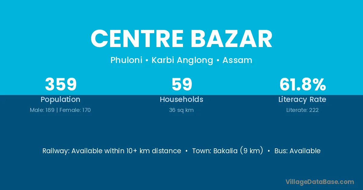 Bakalia (9 km) is the nearest town to Centre Bazar village for major economic activities and is located approximately 9 km away.