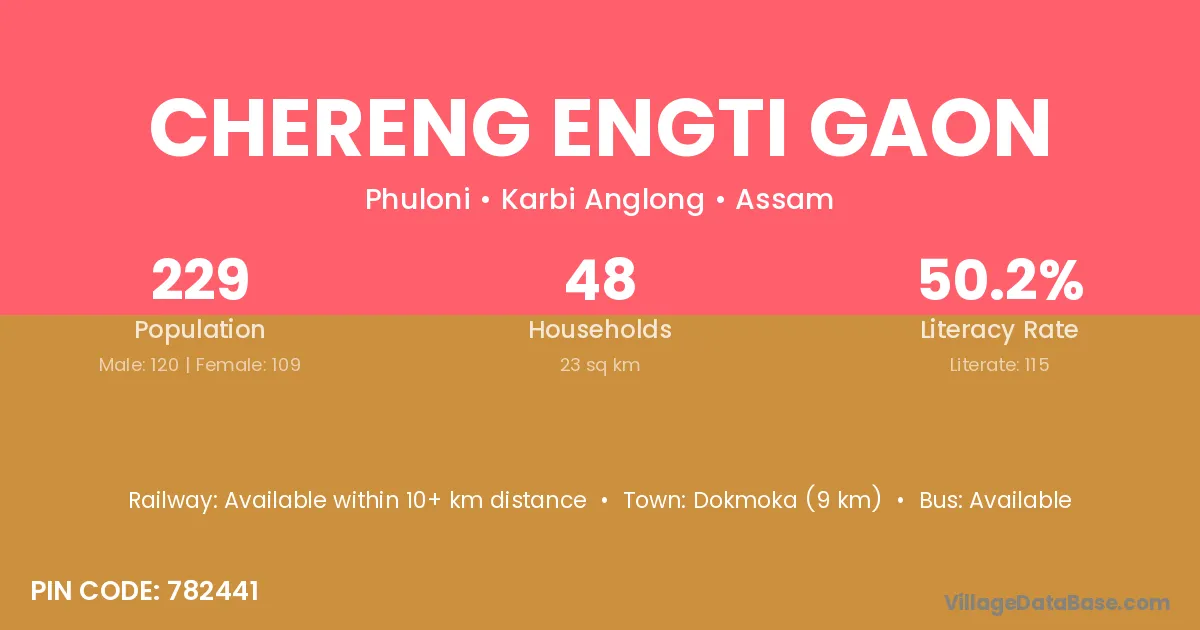 Chereng Engti Gaon village has a total population of 229 people, of which 120 are males and 109 are females.