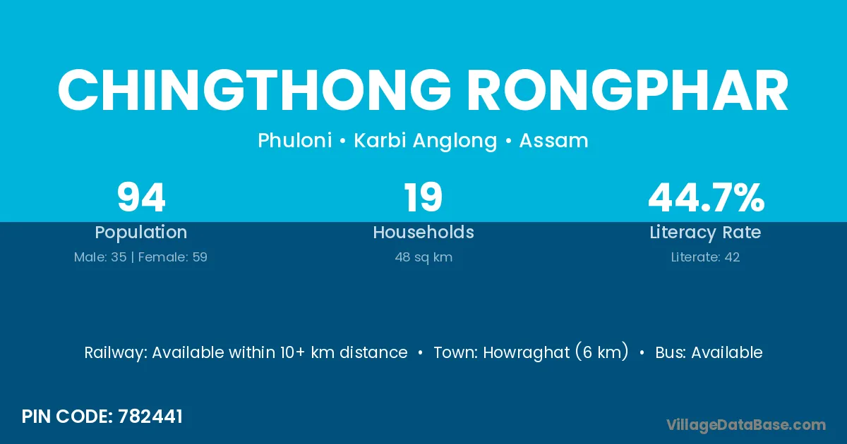 Howraghat (6 km) is the nearest town to Chingthong Rongphar village for major economic activities and is located approximately 6 km away.
